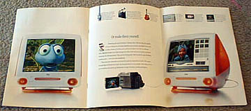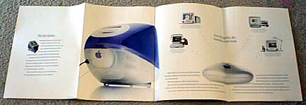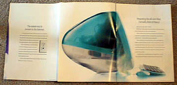 You are bidding on a 4 page iMac pamphlet with two 3 page pull outs, and one 4 page pull out. The add pamphlet pull out titled "Re-birth announcement", is from around 1999, and features the colored slot loading iMacs, starting at $999, the iMac DV starting at $1299, and the iMac DV Special Edition starting at $1499. The pull out is is great shape with no markings or bends, though the cover page does have a few dimples. So if you like Apple Memorabilia, or advertising items, this is for you.